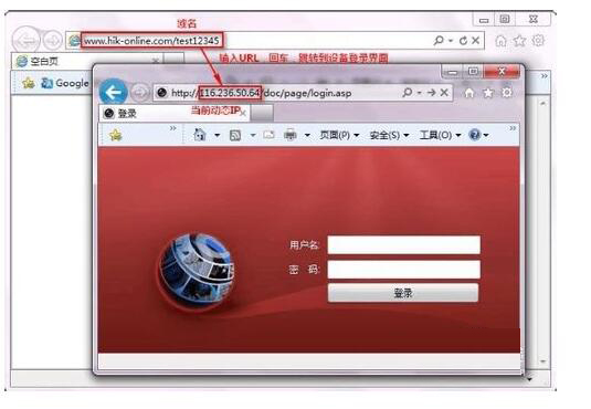 打開IE瀏覽器,在地址欄直接輸入http://www.hik-online.com/自定義域名,例如配置了設備域名為test12345,則直接輸入http://www.hik-online.com/test12345,即可直接鏈接到設備登錄界面。