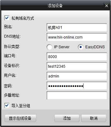 打開iVMS-4200客戶端軟件,進入“設(shè)備管理”界面添加設(shè)備。選擇私有域名方式添加,協(xié)議類型選擇成海康DDNS,填寫設(shè)備域名、用戶名、密碼,即可正常使用iVMS-4200客戶端軟件訪問設(shè)備。
